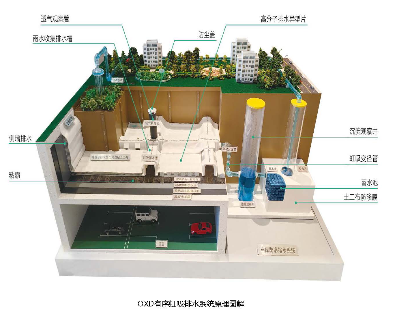 OXD有序虹吸排水系統(tǒng)原理:土壤中的水分通過滲透到達(dá)高分子防護(hù)排水異型片上方,水分經(jīng)土工布過濾后流入高分子防護(hù)排(蓄)水異型片。水經(jīng)高分子防護(hù)排(蓄)水異型片中的空隙不斷流至相鄰陷虹吸排水槽中。在虹吸排水槽上安裝透氣管,虹吸排水槽內(nèi)的水在空隙、重力和氣壓作用下能很快匯集到相對(duì)應(yīng)的出水口,出水口通過管道變徑的方式使虹吸直管形成滿流從而形成虹吸,在虹吸作用下,排水槽內(nèi)的水不斷被吸入沉淀觀察井,流出頂板區(qū)域。流出的水分經(jīng)觀察井排入雨水收集系統(tǒng)內(nèi),待晴天需要對(duì)綠化植物進(jìn)行澆灌時(shí)再對(duì)雨水進(jìn)行循王環(huán)利用。