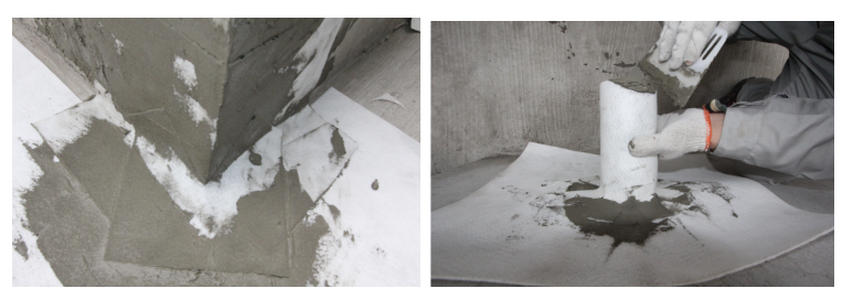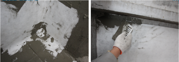 五、施工工藝 濕鋪法: 清理基面→濕潤基層(如基層濕潤無需此項(xiàng)工序)→定位、彈線→攪拌并鋪抹水泥漿-→節(jié)點(diǎn)部位加強(qiáng)處理→鋪貼防水卷材→提漿、排氣、晾放→搭接邊密封→卷材收頭、密封→檢查驗(yàn)收 施工要點(diǎn): 1、基層清理: 1.1基層表面已清理干凈,并基本平整,無明顯突出部位 1.2施工時基面必須濕潤但不得有明水, 1.3各種管道、預(yù)埋構(gòu)、配件已安裝完畢,固定牢固 2、定位、彈線:在基層面排尺彈線,作為掌握鋪貼的標(biāo)準(zhǔn)線,使其鋪設(shè)平直; 3、膠粘劑的制作配備 3.1大面:按水:水泥:專用膠粉=0.6:1:0.004的重量比配制水泥膠粘劑。立面:按水:水泥:專用膠粉=0.4:1:0.004的重量比配制水泥膠粘劑。 按比例準(zhǔn)備好足量的水、膠粉、水泥,將膠粉緩慢加入水中,邊加邊攪拌,使膠粉均勻分散在水中。待膠粉分散均勻后,加入水泥,邊加邊攪拌,待攪拌均勻后方可使用。 3.2水泥浸泡到不連續(xù)出現(xiàn)氣泡后(15-20min),再開始攪拌至均勻。 3.3水泥膠粘劑稠度具有流動性即可使用。 3.4攪拌好的水泥漿料應(yīng)在3-4h內(nèi)用完。 4、鋪貼卷材 4.1鋪貼時,采用趕漿法進(jìn)行施工,先將成卷的卷材放在需要鋪貼的起始部位,然后沿鋪設(shè)方向涂刷水泥粘結(jié)膠漿,并將卷材展開沿彈好的標(biāo)準(zhǔn)線向另一端鋪貼,操作時,卷材不要拉太緊,并注意方向沿標(biāo)準(zhǔn)線進(jìn)行,以保證卷材搭接寬度,同時用滾子壓實(shí)、壓平,中間不得有氣泡,以保證卷材與基層的粘結(jié)強(qiáng)度; 4.2鋪設(shè)下一幅卷材時,一定要注意與上一幅卷材搭接,搭接寬度不低于100mm,并注意粘結(jié)膠漿應(yīng)在卷材邊全部擠壓出漿; 4.3卷材不得在陰陽角接頭,接頭處應(yīng)間隔錯開; 4.4操作中排氣:每鋪完一張卷材,應(yīng)立即用干凈的滾刷從卷材的一端開始橫向用力滾壓一遍,以便空氣排出。 4.5搭接邊及卷材收頭用稠漿密封嚴(yán)實(shí)。 5、細(xì)部節(jié)點(diǎn)處理 1、陽角、陰角: 1.1將陽角、陰角部位浮漿、雜物鏟除,清理干凈后,若基面干燥時散水濕潤,掃除明水。 1.2陽角、陰角用水泥砂漿或防水砂漿抹成圓弧,圓弧半徑不小于50mm。 1.3裁剪一條寬500mm的卷材作為陽角或陰角附加防水層,然后涂刷水泥膠粘劑鋪設(shè)。 1.4陽角、陰角交接處附加層卷材在中心位置向一邊方向裁開,在方形卷材底部中間處劃一刀到卷材中心點(diǎn),使得卷材下沿叉開,然后涂刷水泥膠粘劑鋪設(shè)。 1.5再裁剪一塊(略成扇形)卷材,涂刷水泥膠粘劑后鋪設(shè)在開叉處的上面,將露出部位全部遮蓋。 2、管根部位: 2.1清理管根部位四周基面及管道壁,鐵管進(jìn)行除銹打磨,PVC管表面用鋼絲刷打磨粗糙,基面若基面干燥時散水濕潤,掃除明水。 2.2在管根部涂刷水泥膠粘劑,立面250mm高,平面超出洞口250mm寬。 2.3根據(jù)管道外徑剪一塊方形卷材,尺寸比管根半徑長250mm,沿著卷材中心,劃開呈十字狀或米字狀的缺口,將劃開的卷材套入管道用滿粘法將卷材鋪設(shè)。 2.4根據(jù)管道外徑裁剪一條長度大于管徑100mm,寬度不小于250mm的卷材,將其下端裁成鋸齒狀。將卷材套在管子的外面,然后用滿鋪法將卷材緊密粘貼在管道外壁,上下層接縫粘結(jié)時應(yīng)上下錯開,平整嚴(yán)密,管道上端卷材用金屬箍或用鐵絲扎牢。