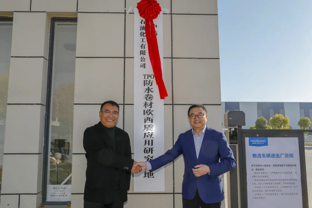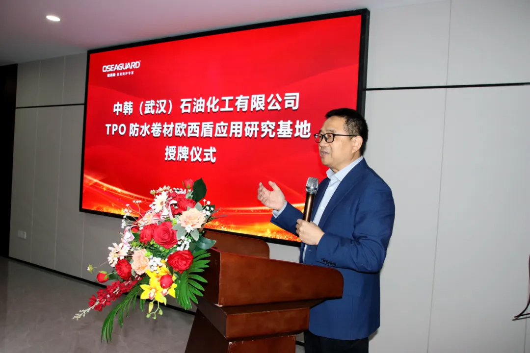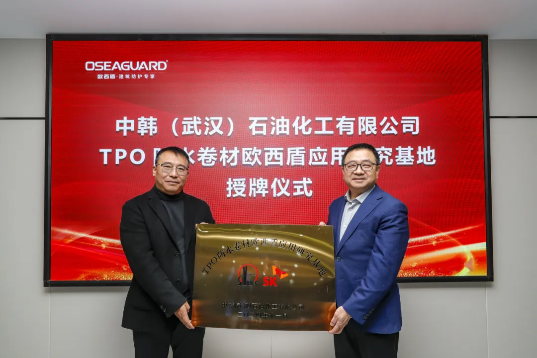 中韓(武漢)石油化工有限公司黨委書(shū)記、董事長(zhǎng)、總經(jīng)理劉百?gòu)?qiáng)為歐西盾TPO防水卷材應(yīng)用研發(fā)基地授牌,至此,雙方合作邁入嶄新階段,將共同致力于推動(dòng)中韓石化超軟聚丙烯在TPO防水卷材領(lǐng)域的技術(shù)革新與應(yīng)用拓展。
