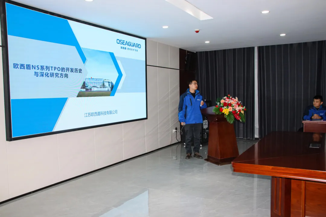 歐西盾防水總工程師顧金佳向大家介紹了《歐西盾NS系列TPO 的開(kāi)發(fā)歷史與深化研究方向》,闡述了TPO防水卷材的發(fā)展史、歐西NS06應(yīng)用歷程、NS應(yīng)用研究方向探討,并就應(yīng)用研究基地的合作內(nèi)容與方向和與會(huì)的領(lǐng)導(dǎo)們展開(kāi)了討論。