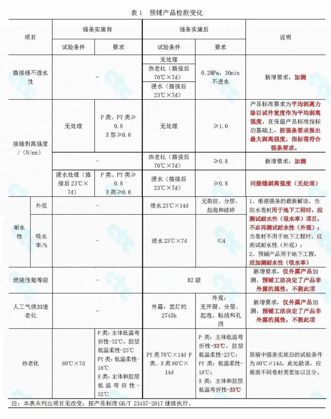 預(yù)鋪防水卷材應(yīng)重點(diǎn)關(guān)注產(chǎn)品的搭接性能。一方面,強(qiáng)條對(duì)防水卷材接縫剝離強(qiáng)度的指標(biāo)高于產(chǎn)品標(biāo)準(zhǔn),但強(qiáng)條未規(guī)定剝離力的取值方式,而產(chǎn)品標(biāo)準(zhǔn)規(guī)定為“平均剝離力”,需要進(jìn)一步加以驗(yàn)證;另一方面,強(qiáng)條新提出了搭接縫不透水性,對(duì)于采用自粘、膠帶等搭接工藝的預(yù)鋪產(chǎn)品,也建議重點(diǎn)驗(yàn)證。