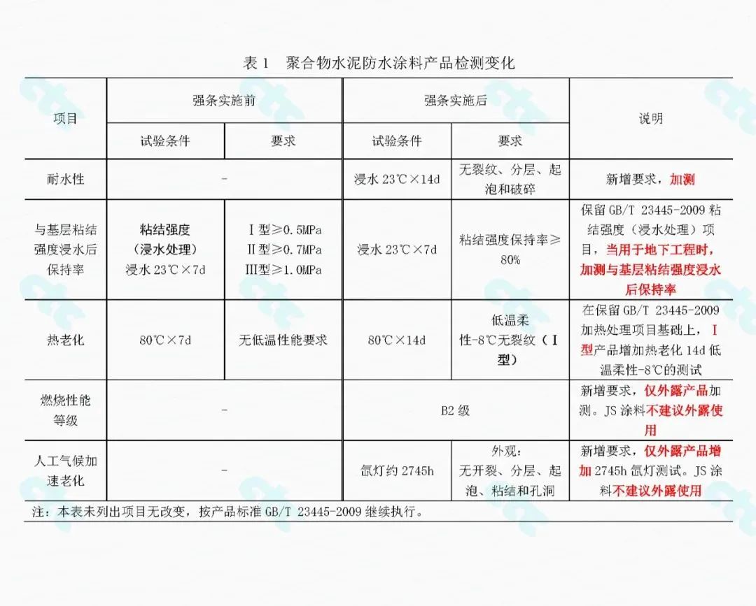 GB/T 23445—2009《聚合物水泥防水涂料》規(guī)定了“粘結(jié)強(qiáng)度(浸水處理)”的要求,但與強(qiáng)條提出的“與基層粘結(jié)強(qiáng)度浸水后保持率”項(xiàng)目并不能等同使用。要求上產(chǎn)品標(biāo)準(zhǔn)規(guī)定了限值,強(qiáng)條要求保持率;試驗(yàn)方法上也不一致。強(qiáng)條的該項(xiàng)要求目前尚沒(méi)有明確的試驗(yàn)方法。國(guó)檢集團(tuán)蘇州公司在制定中國(guó)建筑防水協(xié)會(huì)團(tuán)體標(biāo)準(zhǔn)《高耐水性聚合物水泥防水涂料》時(shí)已開(kāi)展過(guò)大量基礎(chǔ)研究。